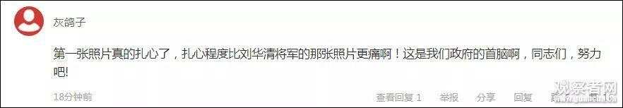 这篇报道下有网友评论:第一张照片真的扎心了,扎心程度比刘华清将军的那张照片更痛啊!这是我们政府的首脑啊,同志们,努力吧!